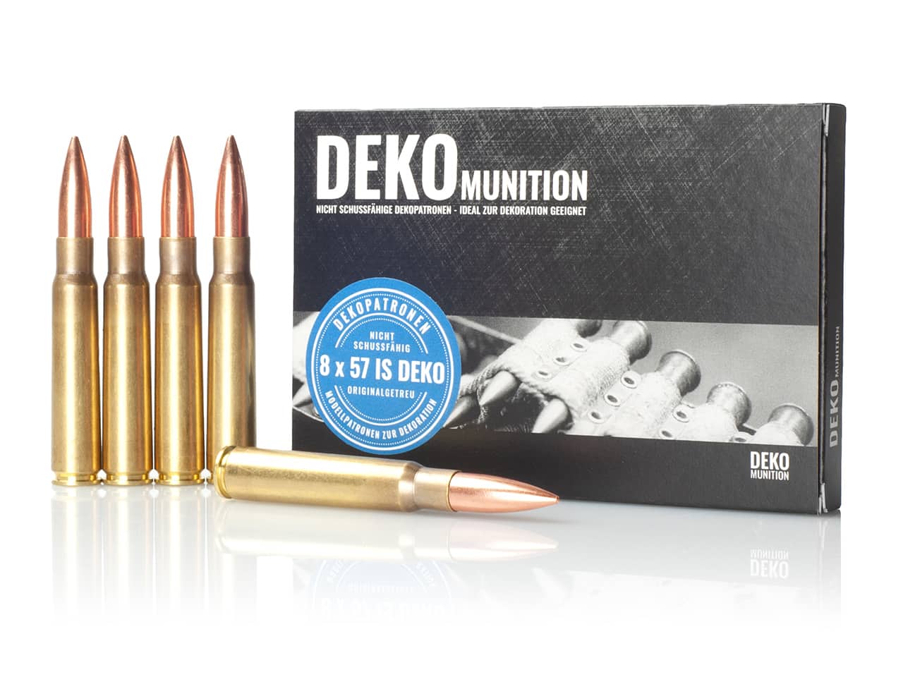 Als zusätzliche Sicherheit bzw. zur Abgrenzung von scharfer Munition wird bei unserer 8x57 IS Dekomunition zusätzlich eine Stahlkugel eingesetzt. Die Herstellung der Deko Patronen erfolgt handwerklich, unter Einhaltung aller gesetzlichen Bestimmungen.