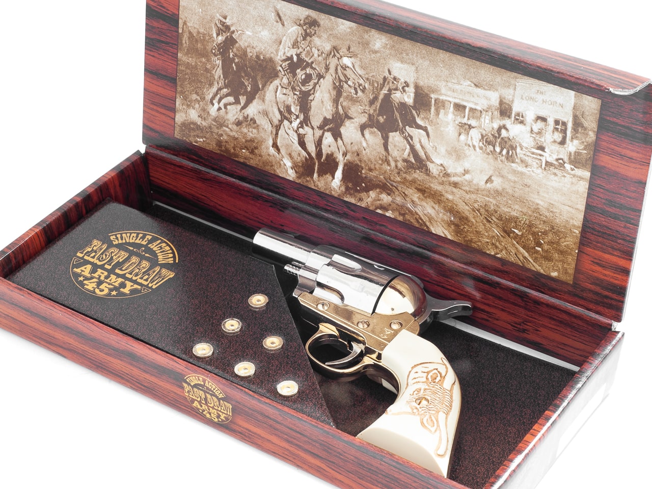 Colt Peacemaker Deko 2,5'' Sheriff's Model mit Munition und Bull Grips - Produktinformationen