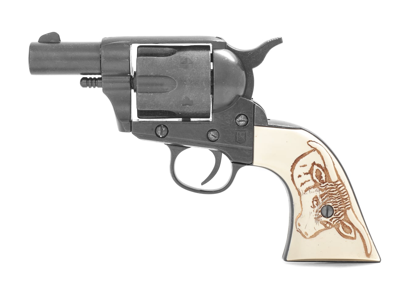 - Nicht schussfähiger Nachbau mit funktionsfähiger Mechanik, Bull Grips aus Elfenbeinimitat und 2,5 Zoll Lauflänge.