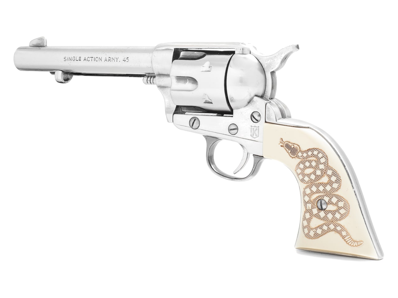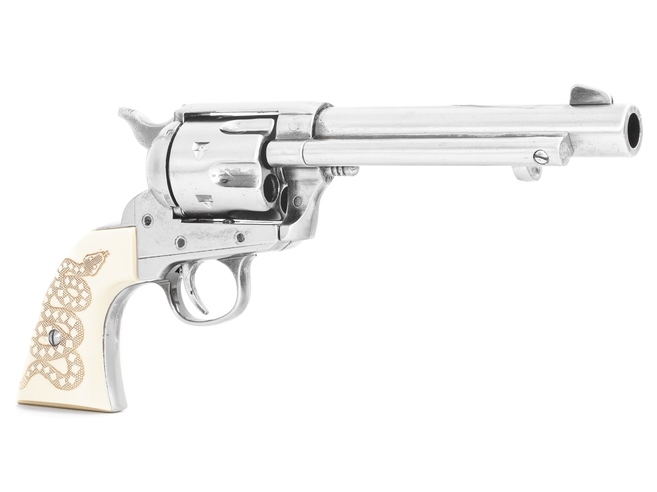 - Nicht schussfähiger Nachbau mit funktionsfähiger Mechanik, Snake Grips aus Elfenbeinimitat und 5,5 Zoll Lauflänge.