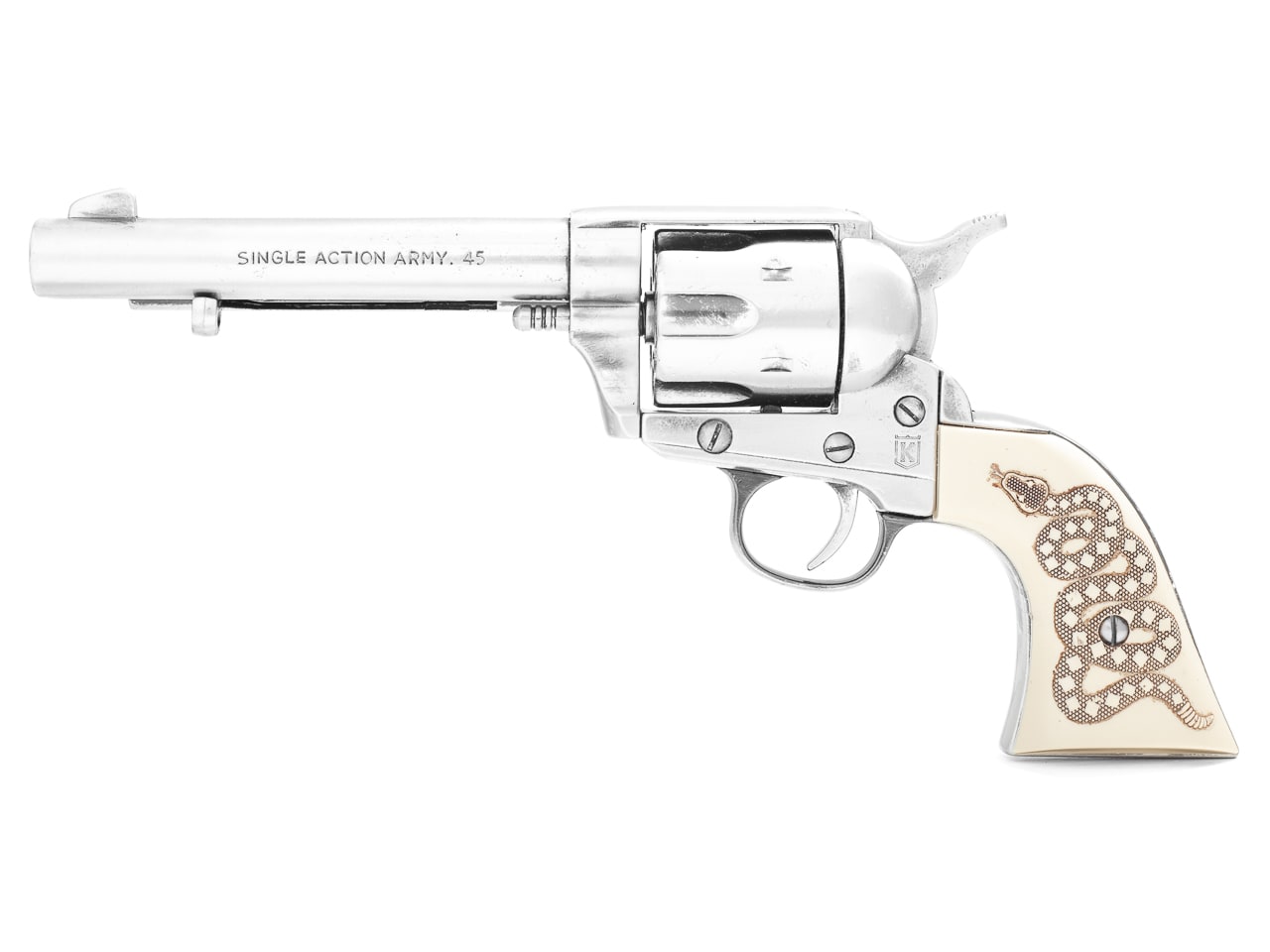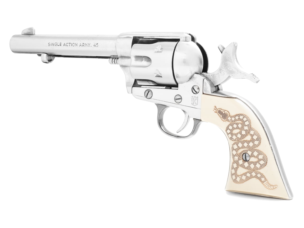 Vorlage für diesen Colt Peacemaker Deko Revolver 5,5'' Artillery mit Snake Grips ist ein Colt Single Action Army .45 (SAA) mit einem auf 5,5 Zoll verkürzten Lauf. Dieser mittellange Revolver wurde ab 1895 von den US-Truppen verwendet und auf dem zivilen Markt unter der Bezeichnung "Peacemaker Artillery" angeboten.