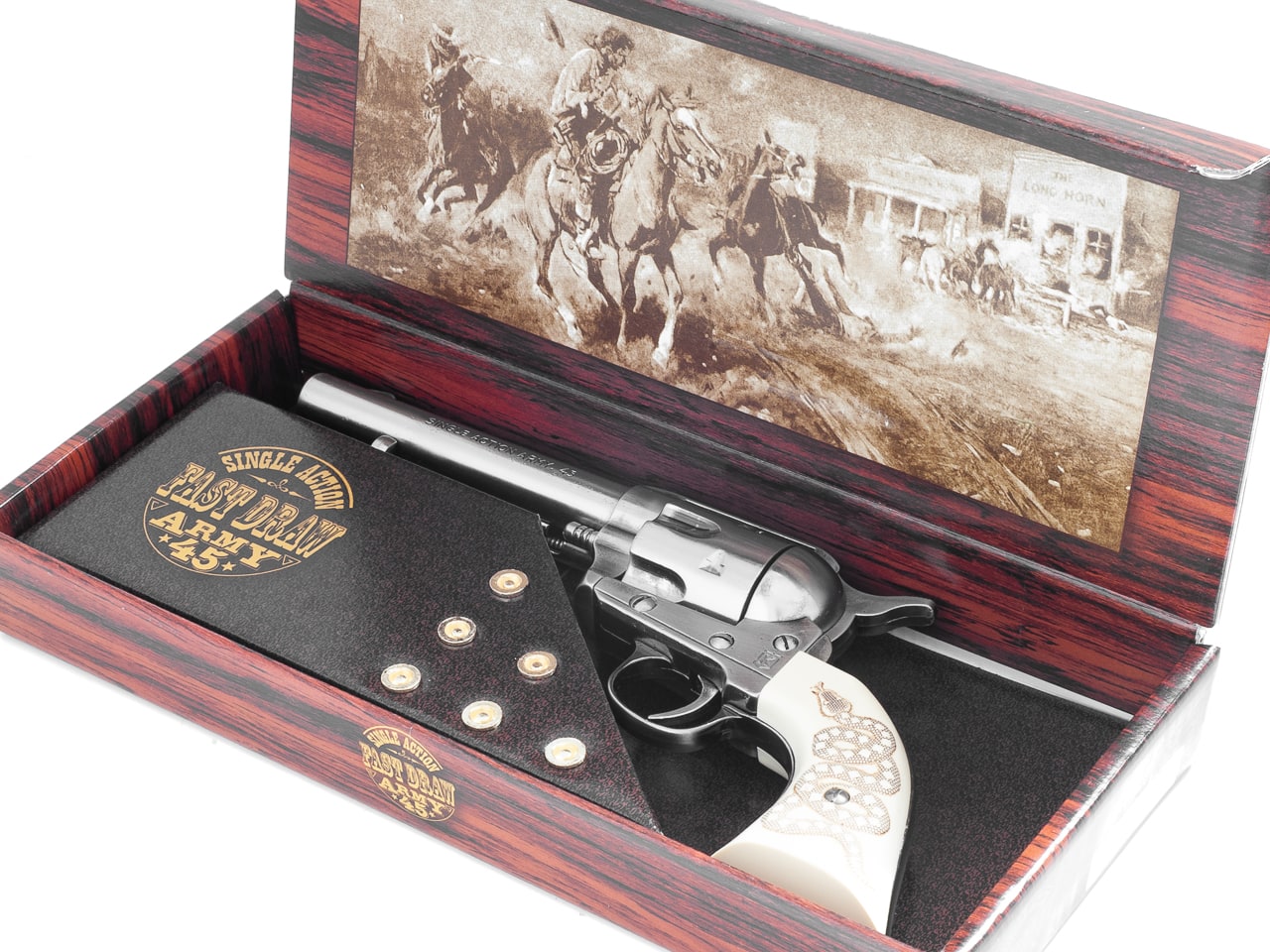 Die verbauten Griffschalen der Replika sind passgenau und werden aus hochwertigem Elfenbeinimitat (Kunstharz) gefertigt. Zusätzlich wird die linke Seite des Laufs mit dem originalgetreuen Schriftzug "Single Action Army" markiert.