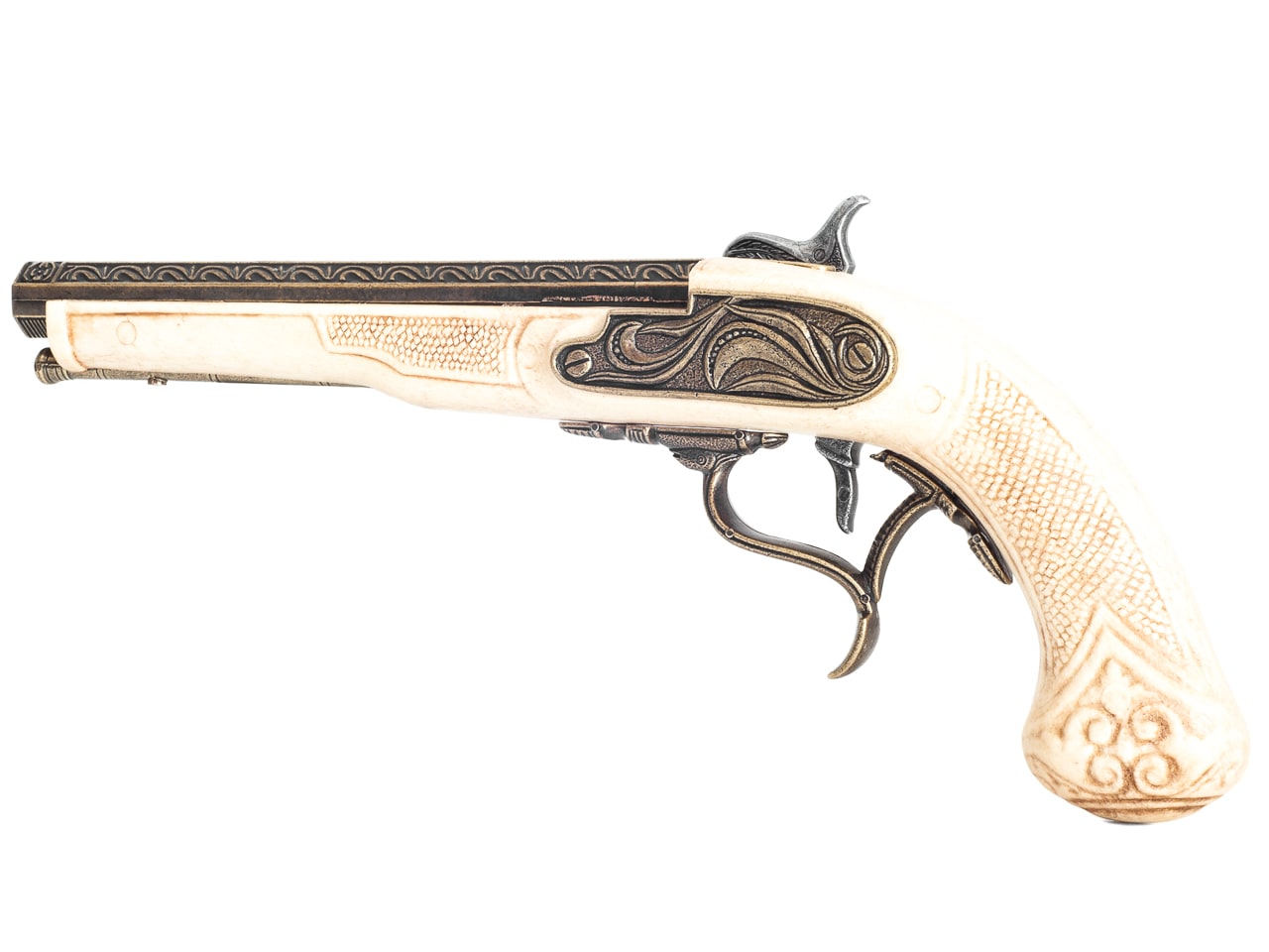 Diese modernisierte Deko Hadley 1807 Achtkantlauf Perkussionspistole wird von Kolser hergestellt und ist aus nicht waffenfähigem Metall und langlebigem Resin (Kunstholz oder Elfenbein-Imitat) gefertigt. Die Replika Vorderlader Pistole verfügt über ein bewegliches Perkussionsschloss und kann gespannt sowie abgeschlagen werden.