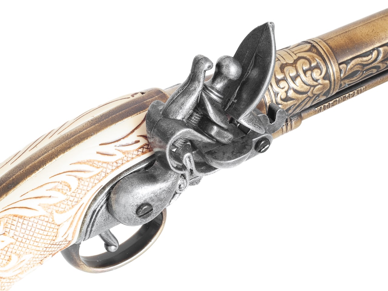 Der Rundlauf, die Mechanik und der Korpus der Deko Liege 1710 Queen Anne Duellpistolen sind mit zeitgenössischen Motiven verziert. Der Lauf ist zusätzlich mit einer Mündungswulst ausgestattet, kann allerdings bei diesen Repliken nicht abgeschraubt werden.