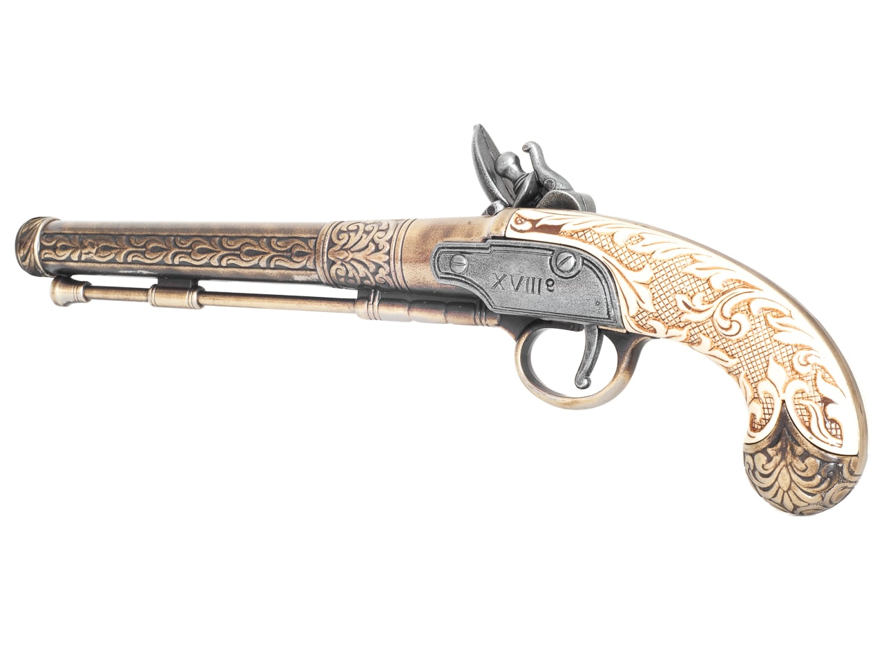 Diese belgische Deko Liege 1710 Queen Anne Pistole wird von Kolser hergestellt und ist aus nicht waffenfähigem Metall und langlebigem Resin (Kunstholz oder Elfenbein-Imitat) gefertigt. Die Replika Vorderlader Pistole verfügt über einen beweglichen Steinschloss-Mechanismus und kann gespannt sowie abgeschlagen werden.