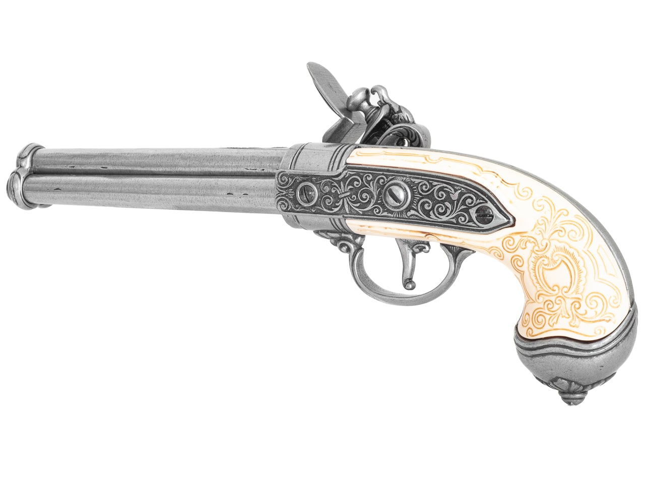 Diese Deko Lorenzoni 1680 Triple Barrel Pistole wird von Denix hergestellt und ist aus nicht waffenfähigem Metall und langlebigem Elfenbein-Imitat (Resin) gefertigt. Die Replika Vorderlader Pistole verfügt über ein drehbares Laufbündel mit 3 Läufen, einen beweglichen Steinschloss-Mechanismus und kann gespannt sowie abgeschlagen werden.