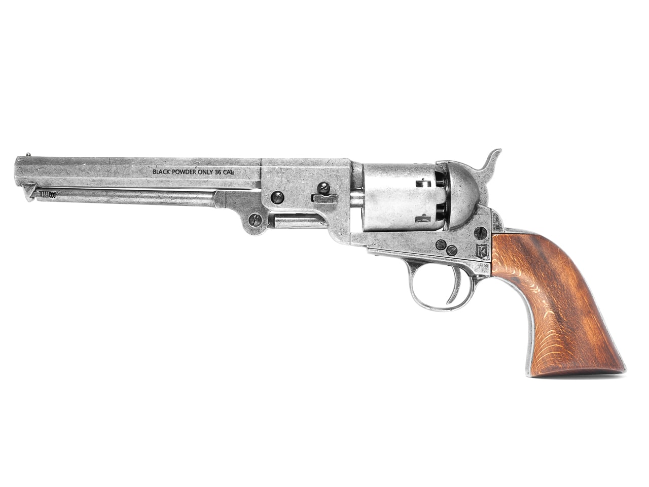 Vorlage für diesen Colt Navy 1851 Deko Revolver ist der zwischen 1847 und 1850 entwickelte Colt Navy Model 1851, der zu den beliebtesten Vorderladerrevolver der damaligen Zeit gehört. Er wurde von allen Truppenteilen und Zivilisten gleichermaßen geschätzt und ersetzte die schweren und unhandlichen Colts vom Typ Patterson und Dragoon. Wurden diese älteren Revolver noch überwiegend in Taschen und Holstern am Pferd aufbewahrt, konnte der kompakte Colt Navy bequem im Holster am Körper getragen werden. Der Colt 1851 Navy ist der direkte Vorgänger des Colt Single Action Army 1873 "Peacemaker" und wurde bis zu dessen Produktionsbeginn 1873 hergestellt.