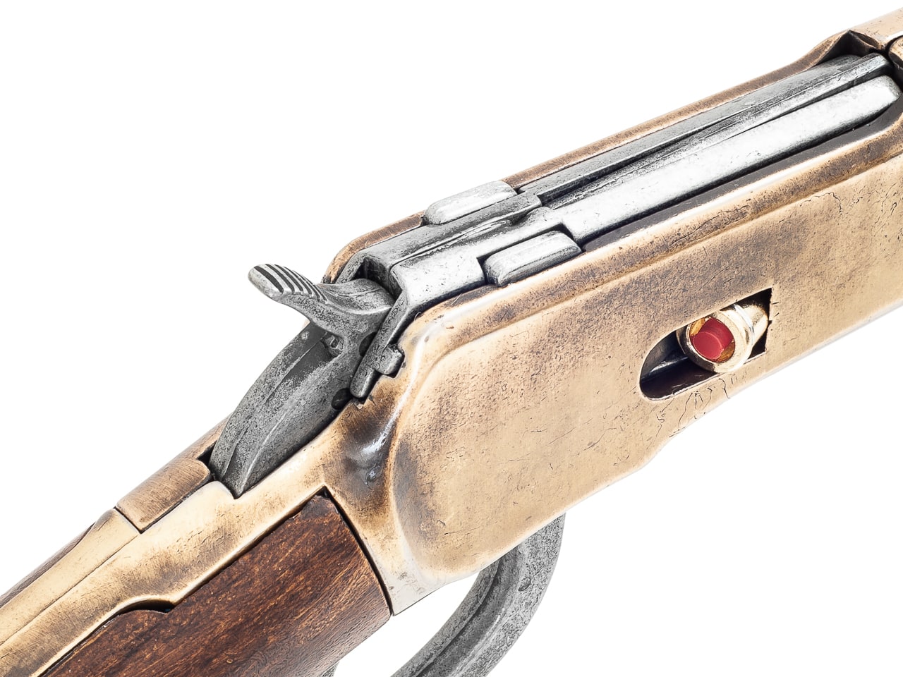Hochwertige Winchester 92 Deko Mares Leg mit Dekopatronen, automatischem Patronenauswurf und funktionsfähiger Mechanik. Diese erstklassige, nicht schussfähige Replika wird nach Vorlage der berühmten Filmwaffe hergestellt und lässt sich durchrepetieren sowie abschlagen. Sie kann mit Dekopatronen geladen werden und verfügt über eine automatische Patronenzufuhr sowie einen automatischen Patronenauswurf. Die mitgelieferten Dekopatronen können mit handelsüblichen Zündhütchen bestückt werden. Dadurch ist es mit dieser Dekowaffe möglich, einen "Schuss" zu simulieren - inklusive Knall und Rauch.