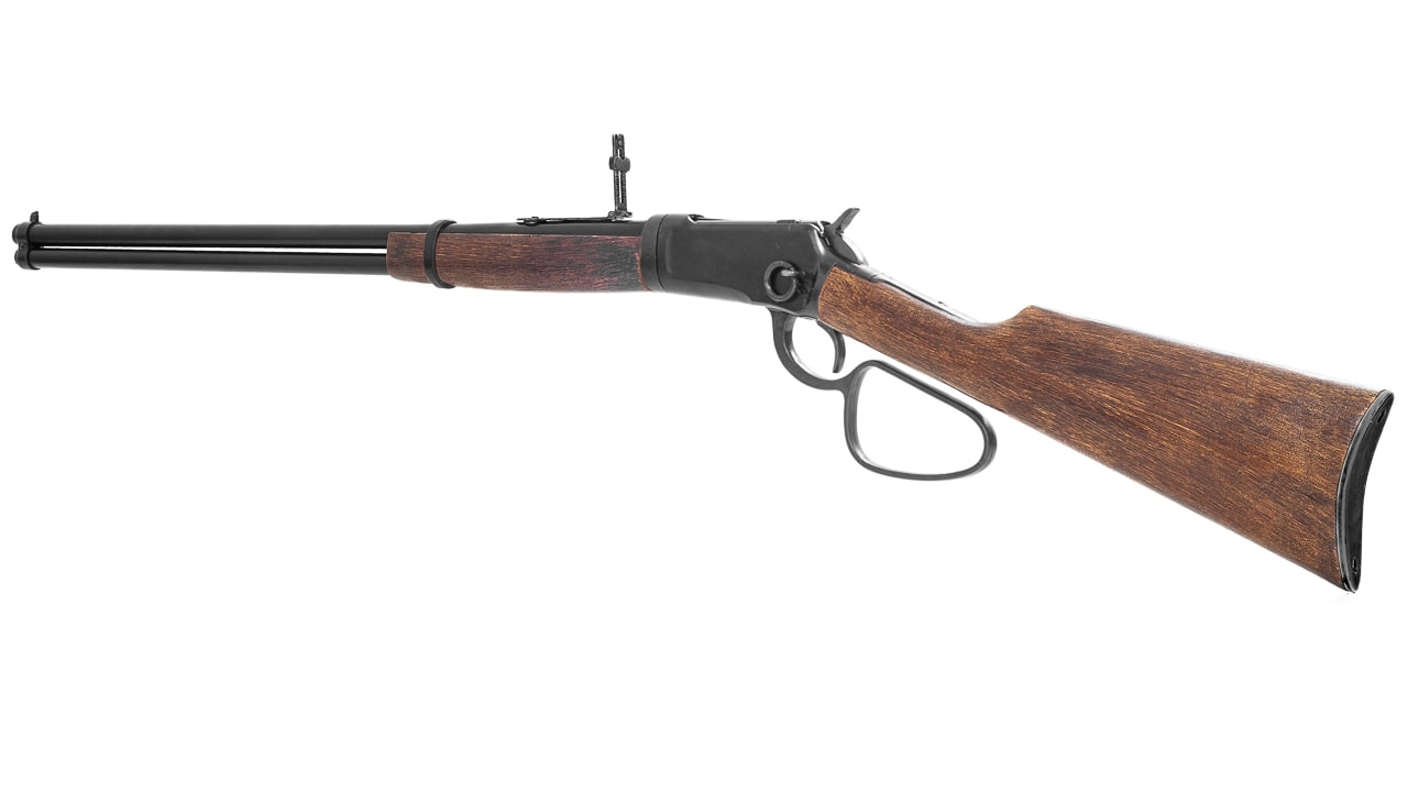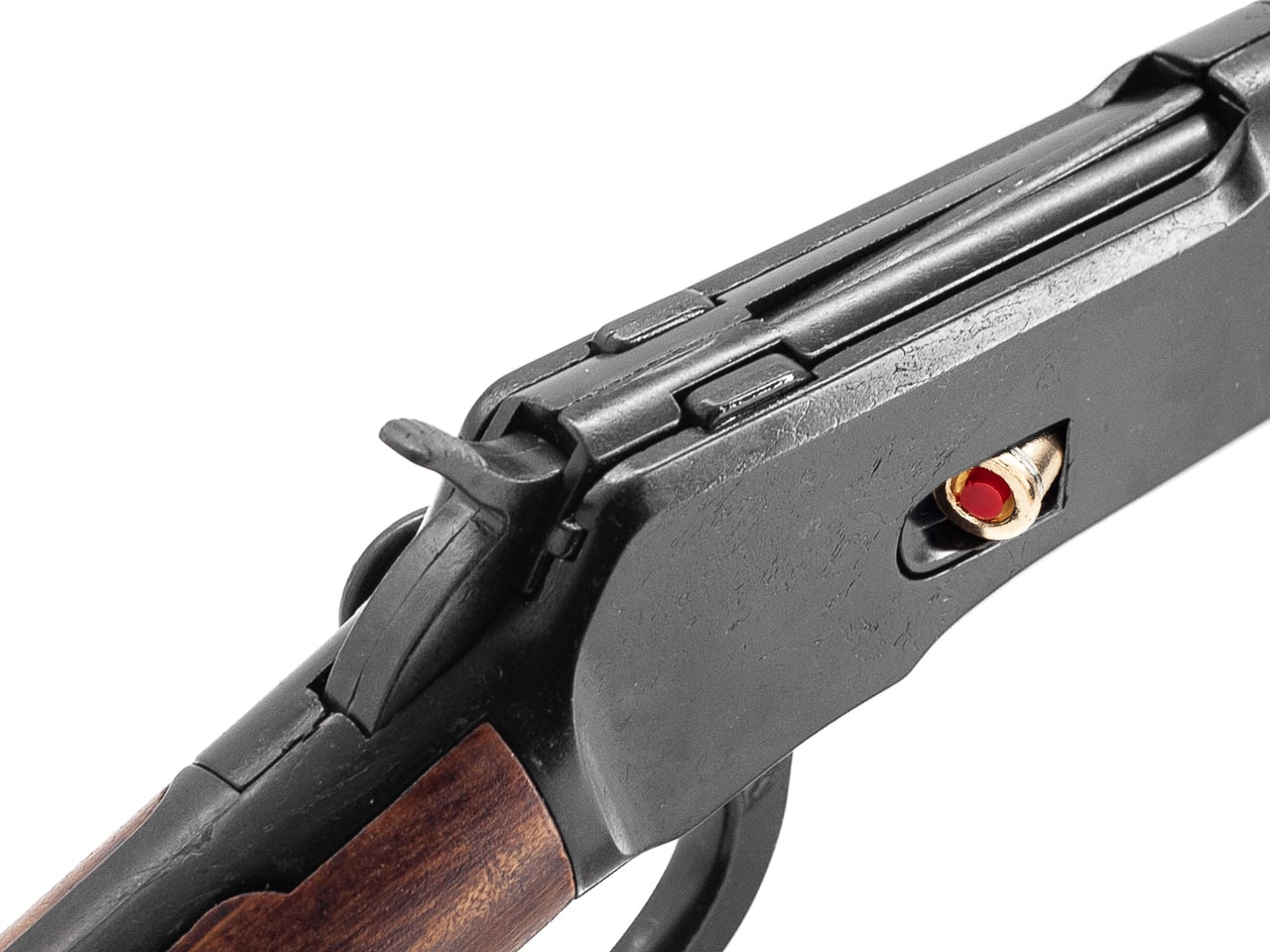 Hochwertige Winchester 92 Deko Model 1892 SRC (saddle ring carbine) Long Range mit Large Loop und funktionsfähiger Mechanik. Diese erstklassige, nicht schussfähige Replika wird nach Vorlage eines seltenen Originals hergestellt und lässt sich durchrepetieren sowie abschlagen. Sie kann mit den passenden Dekopatronen geladen werden und verfügt über eine manuelle Patronenzufuhr sowie einen manuellen Patronenauswurf. Werden die passenden Dekopatronen mit handelsüblichen Zündhütchen bestückt, ist es möglich, einen "Schuss" zu simulieren - inklusive Knall und Rauch.